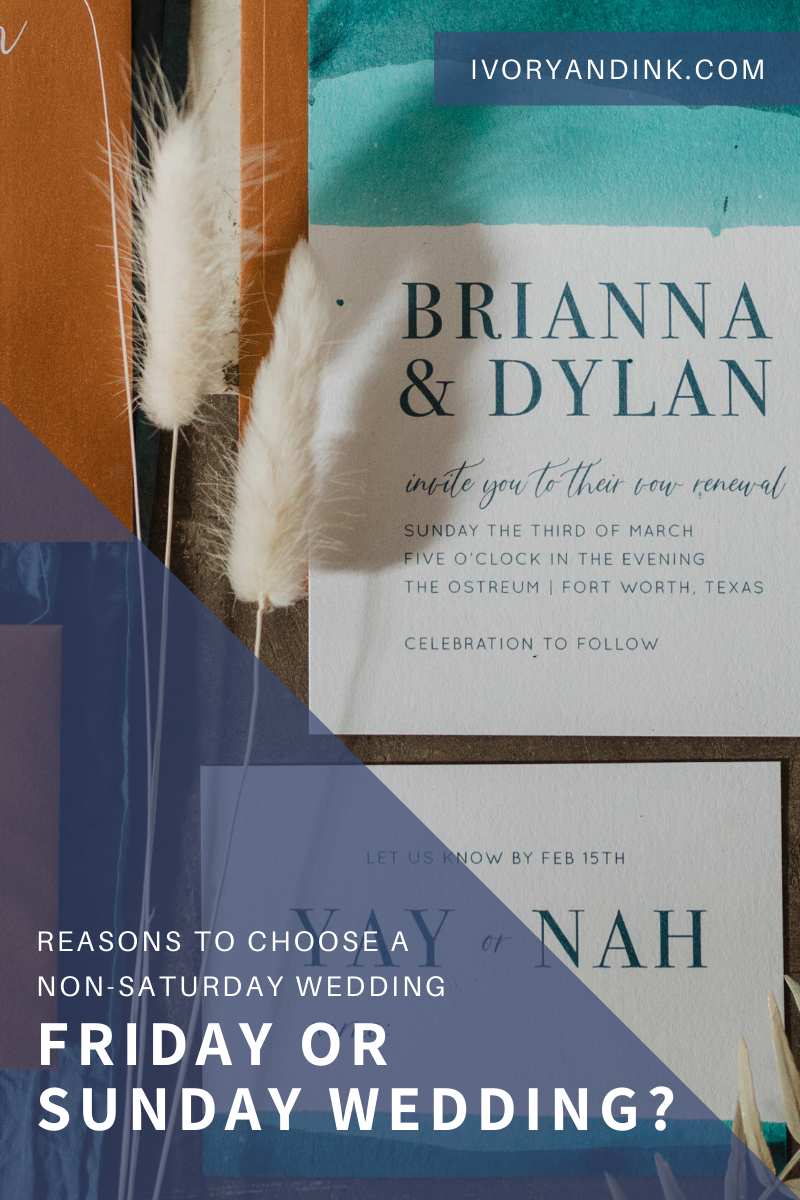 - Save Some Money – since Saturday weddings are the most popular day of the week for weddings, it makes them the most expensive. Choosing a Friday or Sunday wedding day will cost less than choosing a Saturday wedding day.
